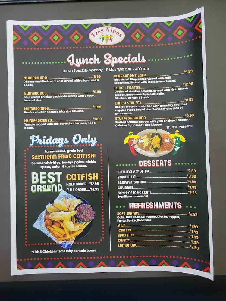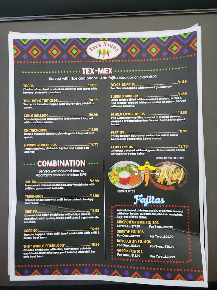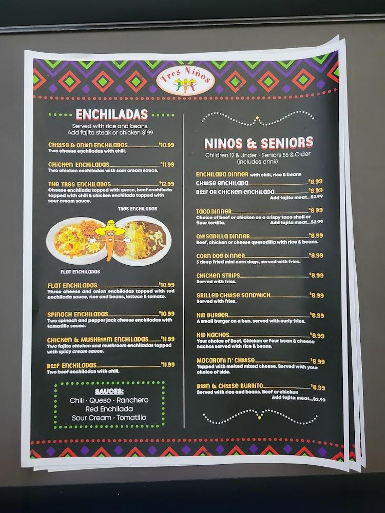 The menu at Tres Ninos is diverse, offering 102 mouthwatering items. Appetizers like queso and fresh guacamole set the tone. Signature dishes include flavorful tacos, chimichangas, and enchiladas stuffed with various fillings. Fajitas and grilled meats remain popular choices among guests.